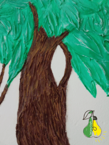 The art space with the giraffe was created very simply. First, I drew the outlines with a regular pencil, and then I gradually applied the putty to the pre-moistened wall. The pattern on the putty needs to be applied before the putty hardens. It is important to make the ready-made solution in small quantities. I thought that the tree bark and leaves can be of any shape, so I decided to experiment a little with sticks. This is what the tree looked like from a close distance.