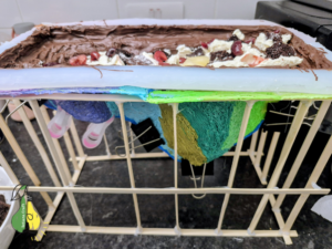 For the core of my lion cake, I separately baked a rich chocolate sponge cake (biscuit). I then cut this into small, manageable pieces. I dipped these sponge cake pieces into a smooth buttercream and then packed them tightly inside the hollow lion mold.