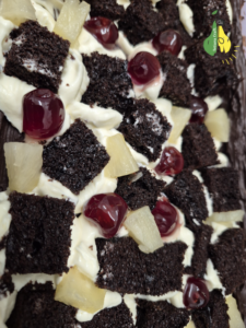 To enhance the flavor and texture, I also added sweet, glazed cherries and small pieces of preserved chocolate between the cake layers. This process of layering and tightly packing ensures that the final cake holds its shape perfectly and delivers a moist, multi-textured bite. (Detailed photos of this layering process are provided below.)