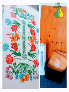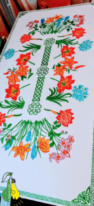 When I finished painting the flowers, I found that the drawing looked unfinished. I thought about painting ivy along the edges of the table, but it seemed to me that it would overload the overall look of the drawing. I went online to look at various ornaments and when I saw Celtic patterns, it was love at first sight. Celtic ornament is beautiful. I found plastic stencils on the Internet. I used them and this is what I got as a result.