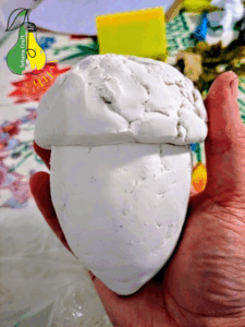I started working on the acorn at a time of year when there were no more acorns on the oak trees. My husband and I found a few in the fallen leaves. I also found a few pictures online and, using those as reference, began creating the acorn out of plasticine. This is what the beginning of the acorn looked like.