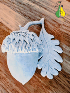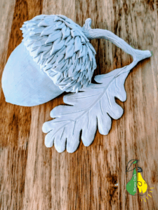 Here’s what the final result looked like. The plasticine acorn consists of three parts: the acorn itself, a twig, and a leaf. All the parts are connected by small protruding parts and indentations on the other side.
