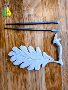 Once I had finished the acorn made, I started sculpting the twig and leaf. The photo below also shows the tool I used. This is a special tool used when working with clay, but it’s also great for working with plasticine.